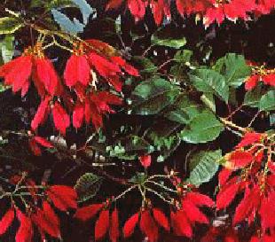 PoinsettiaA tropical American shrub, Euphorbia Pulcherrima, having petallike, usually scarlet bracts beneath small yellow flowers, widely grown as a houseplant. Discovered by J.R. Poinsett (1799-1851), U.S. Minister to Mexico. |