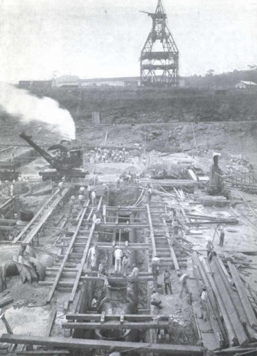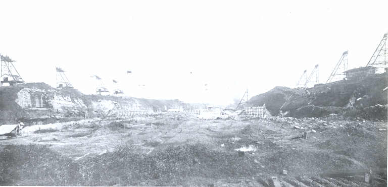 South of the French Canal the Mindi Hills cross the line of our canal between Gatun and Limon Bay, rising to the elevations 50 and 60. As the bulk of the excavation is rock, steam shovels were put to work to secure the requisite width and depth. It was thought that when sea-level was reached the shovels would have to be replaced by dredges, as the Mindi River is within a few hundred yards of the area, and the French Canal borders it. As the work progressed, however, notwithstanding the seamy nature of the rock, it was found that a relatively narrow levee would keep out water from the French Canal, and the seepage was so small as to be easily handled by pumps. One shovel-cut to grade was made, when the high water in December, 1909, flooded the pit and work was suspended until recently, when the soft material was removed by a suction dredge. The water is being pumped from the pit so as to permit completion of the work by steam shovels.