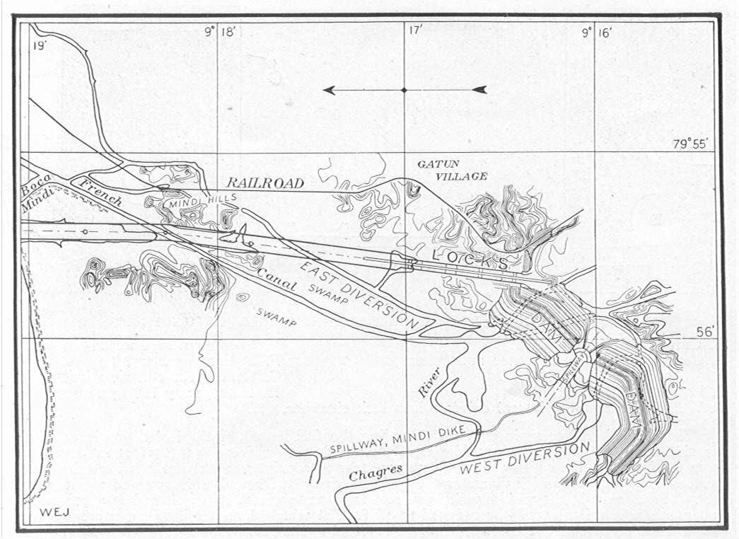 The spillway dam will be of concrete with its crest at elevation 69. Piers 8.5 feet wide will be built on top of the crest, 53.5 feet centers, grooved for Stoney gates, which will close the openings and complete this portion of the dam. The trace of the dam will be the arc of a circle 740 feet long, with 14 openings, which, when the gates are raised to the full height, will permit a discharge of 140,000 cubic feet per second. The water discharged over the dam will pass through a diversion channel into the old bed of the Chagres. (See map)
