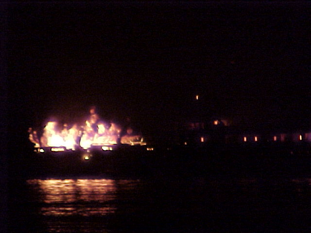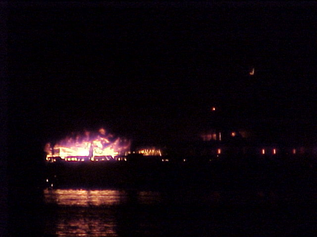At low water, the ship's hull rested on the bottom and continued to burn.