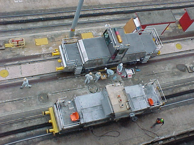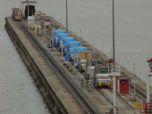 keep vessels aligned inside the lock chambers. To assist ships, locomotives move