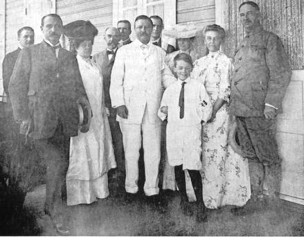 | Precedent was broken when a President of the United States left the country to see how work was progressing in the Canal Zone. Grouped around President Theodore Roosevelt (center, in a white suit) are: John F. Stevens, Chief Engineer, left front; Mrs. Theodore P. Shonts, wife of the Chairman of the Isthmian Canal Commission; Joseph Bucklin Bishop, the Commission's Secretary; Dr. Presley M. Rixey, Surgeon General; Mr. Latta, a White House Secretary; Mrs. Roosevelt; Mrs. Stevens; and Mr. Shonts, Isthmian Canal Commission Chairman. The small boy is Donald F. Stevens, son of the Chief Engineer. |